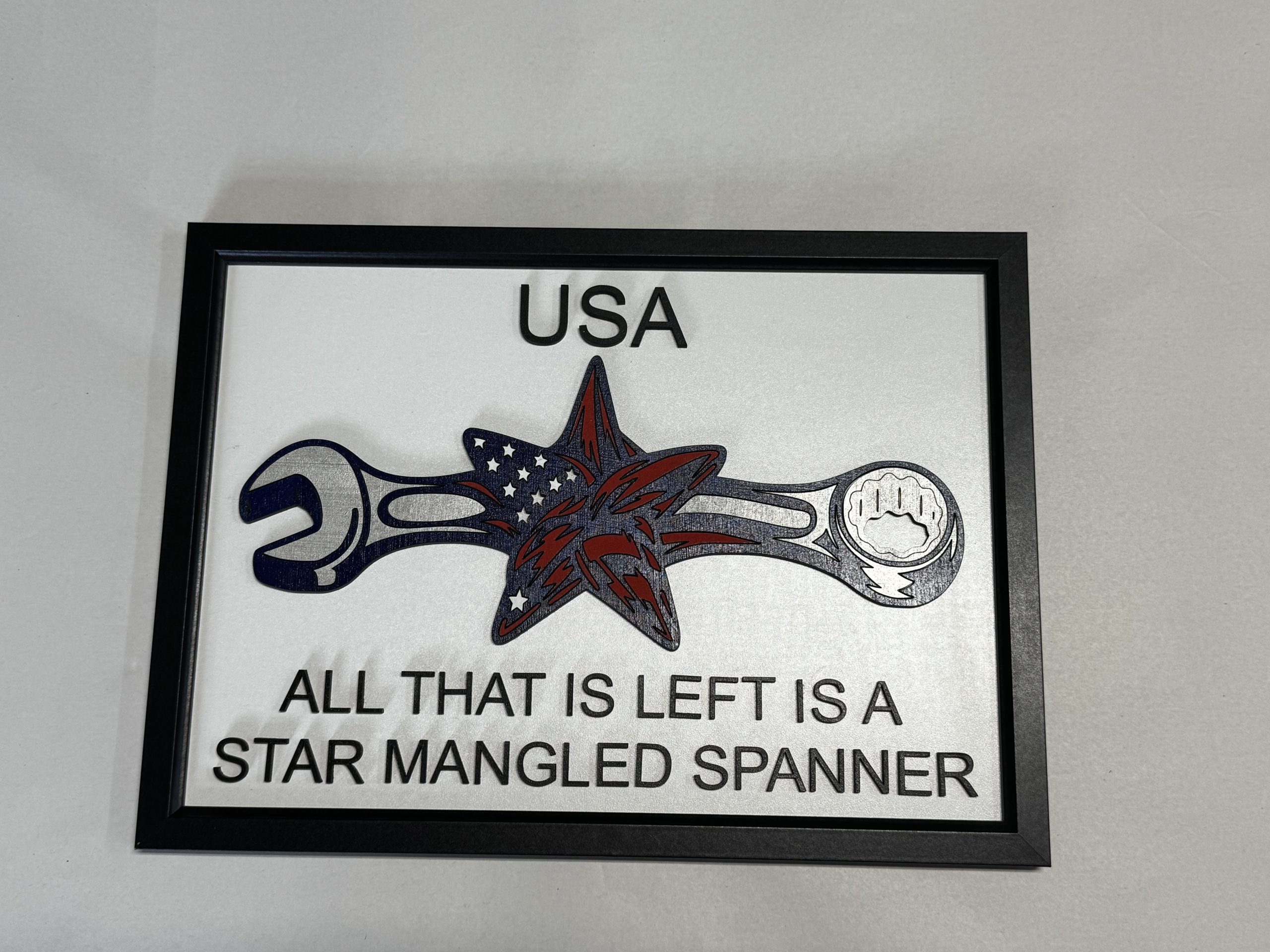 Add a bold, patriotic touch to your space with this handcrafted 3D wall art. Made from high-quality MDF and presented in an A4-sized black picture frame, this piece features a twisted spanner design layered with a red, white, and blue star inspired by the USA flag. The raised lettering reads “USA” at the top and “ALL THAT IS LEFT IS A STAR MANGLED SPANNER” below, creating a striking three-dimensional effect. Perfect for garages, workshops, man caves, or any area where you want a conversation-starting blend of industrial style and American pride.
